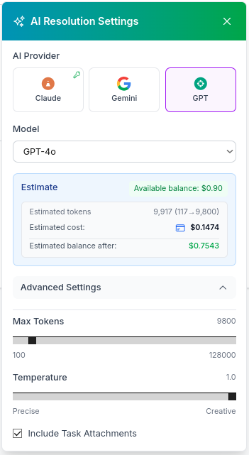 Before triggering the AI agent to work on your task, you can adjust AI provider/model parameters in the 'AI Resolution Settings' window by clicking on the gear icon besides the 'Generate AI Resolution' button.